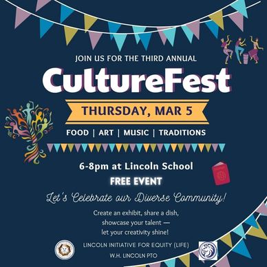 Come celebrate the rich diversity of our Lincoln community at Culture Fest! Host a table and share your culture, cook a favorite dish from your country, or simply join us and connect with your children’s classmates and their families. It will be a special evening celebrating the many cultures that make our community so vibrant.